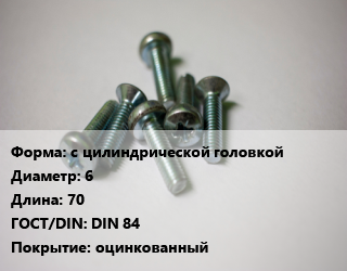 Винт с цилиндрической головкой 6х70 DIN 84 оцинкованный, цена за шт, кг цена от 11.7 ₽ / кг, где купить, условия доставки в Томске и Томской области