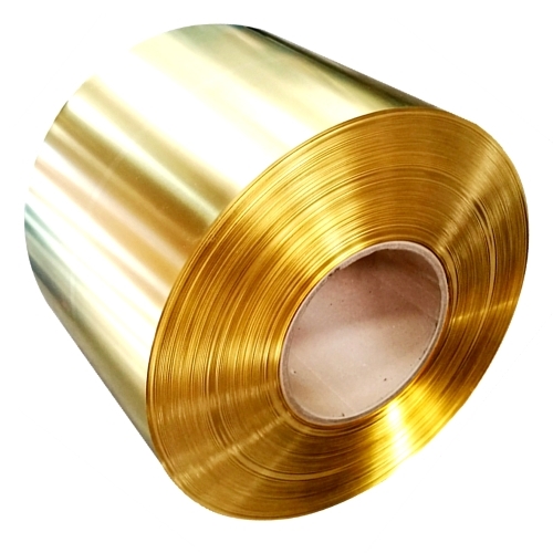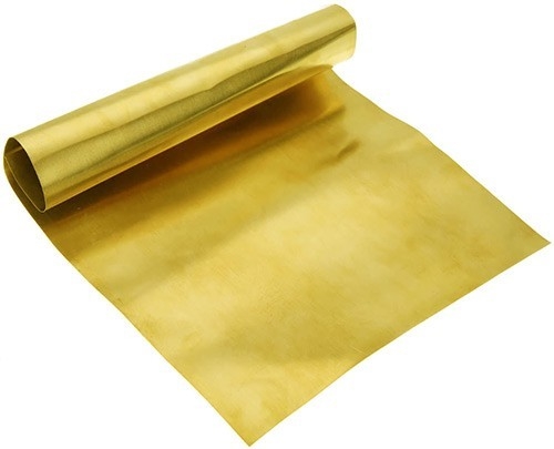 Фольга латунная выпускается в виде прямоугольных полос немерной длинны блестящего золотого цвета. Это достаточно тонкое изделие, которое производится методом холодного проката. Горячая прокатка в этом случае не подходит, так как при нагреве латунь теряет свои свойства, в частности пластичность. Ее толщина может колебаться от 0,015 до 1 мм, по индивидуальному запросу есть возможность создания фольги толщиной от 0, 004 мм. В основу данного сплава входит медь, а в качестве легирующего элемента выступает цинк. В зависимости от других составляющих компонентов выделяют следующие марки: Л90, Л85, Л80, Л70, Л68, Л63, ЛС59-1, ЛО90-1, ЛО62-1, ЛМц58-2, ЛЖМц59-1-1. Химический состав и производство утверждены ГОСТ 15527.